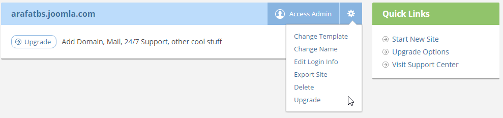 From here, one can change their site's look and feel by changing its template. The site URL (the part before .joomla.com) can also be changed using the Change Name option. If you want to move the free site to your own hosting account, use Export or Upgrade feature. The gear menu also allows you to change login information and even delete the site permanently.