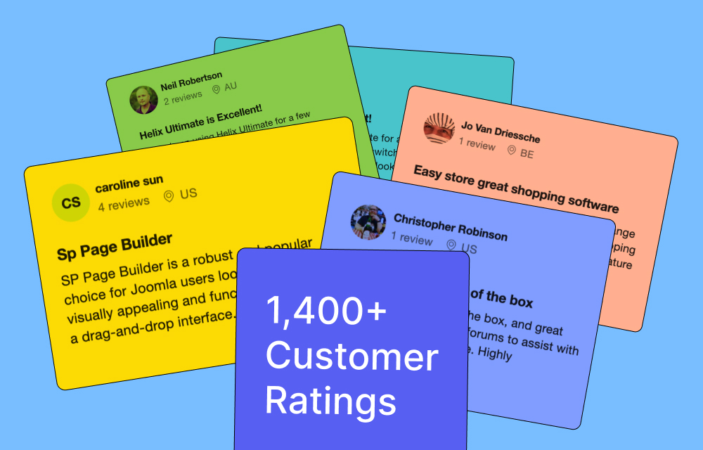 We’ve always strived to go the extra mile to ensure our customers feel valued and satisfied, and our efforts have truly paid off. With an impressive 91% happiness score based on over 1,400 customer ratings, it shows that we’re on the right track in creating experiences that matter to you. Plus, we’re proud to have received 30+ reviews on the Joomla Extension Directory and over 90+ reviews on TrustPilot.