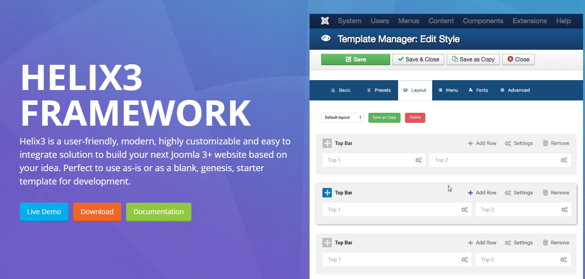 The theme is developed based on Helix3 framework and uses several modules and extensions. The reservation system is powered by Solidres, a specialized component for hotel booking management. Helix is a free drag-and-drop Jomla 3+ site builder. It's an easy to use and highly customizable framework well-integrated with SP Page Builder. You can learn more about Helix from here. And yes, Helix is developed by JoomShaper.