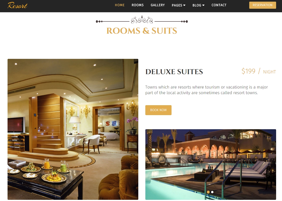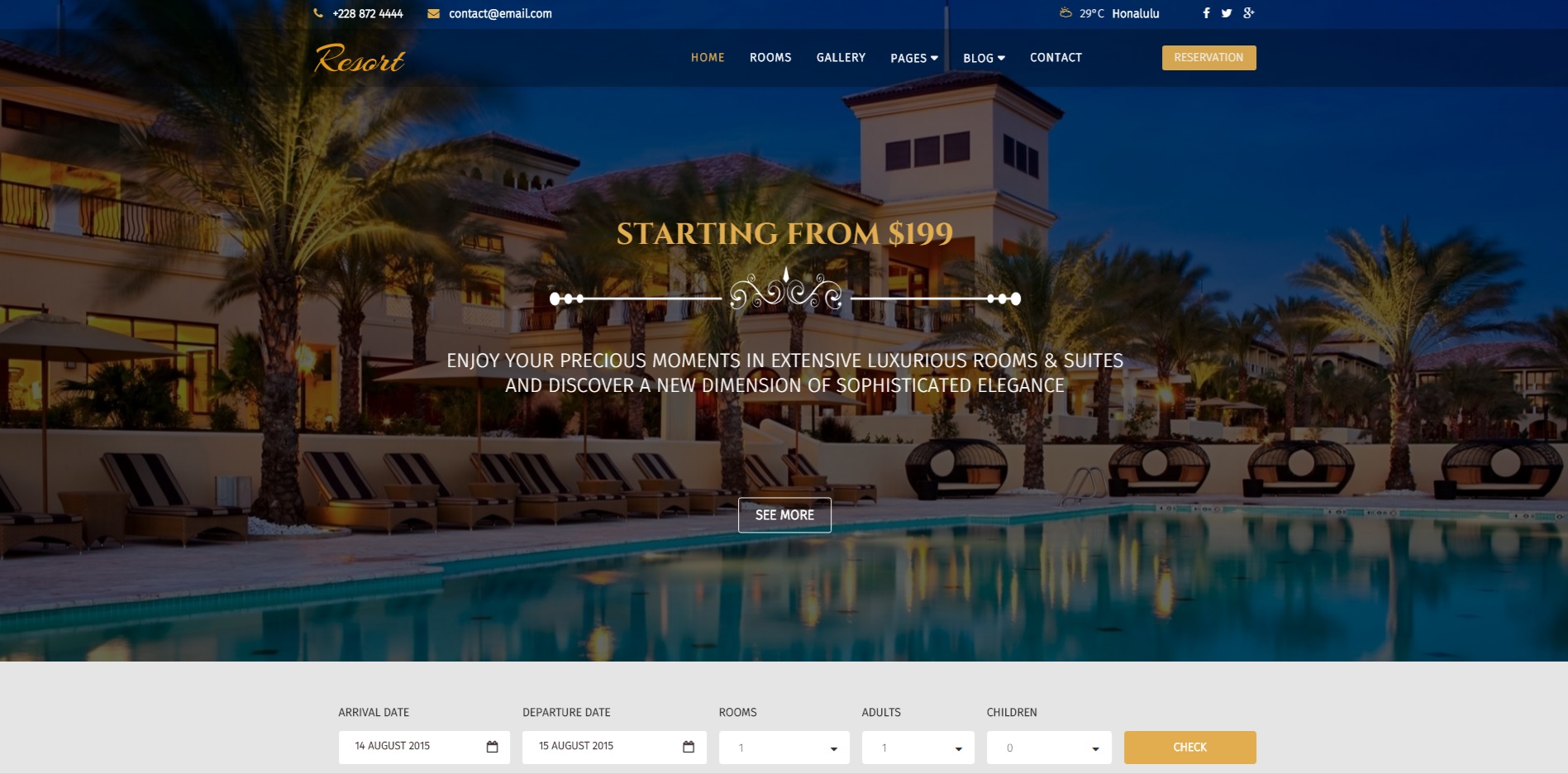 The Resort homepage got a pure combination of features and fields to express your hospitality business in a gorgeous way. The page starts with an option to display the business's contact number and email address. On the top right corner, you can place your social media links and a brief weather feed. The top menu bar has multi-layer navigation ability to accommodate the complete set of important stuffs. There is a 'Reservation' button at the top right side of the nav-bar which takes the user on the main resort booking page.