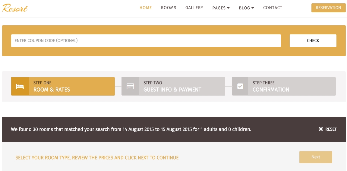 The Resort theme uses Solidres solution, a popular third party component for managing hotel and hospitality booking system. The site admin needs to input the hotel/entity name, rooms, facilities, tariff, payment mechanism and other relevant information to make the front-end functional. Please see detailed information regarding how to use Solidres on this official documentation page.