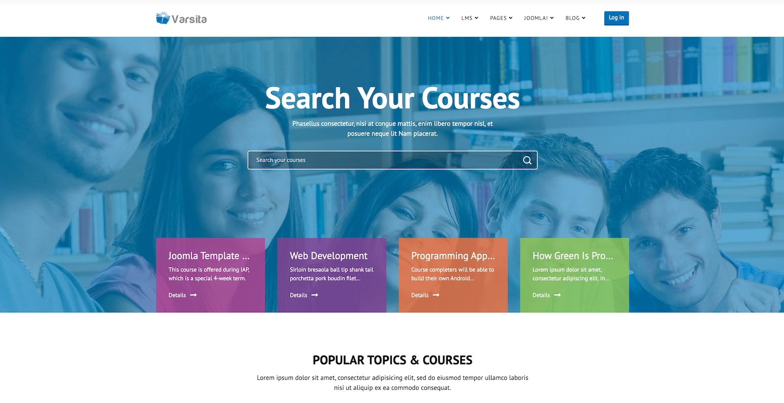 Varsita is a clean, modern, and professional Joomla template for all kinds of schools, universities, courses, and education business. We built this layout specifically for educational institutions, training organizations and include easy-to-use customization features. It will potentially help schools, faculty members, and students. You can build any basic learning management system website with Varsita.