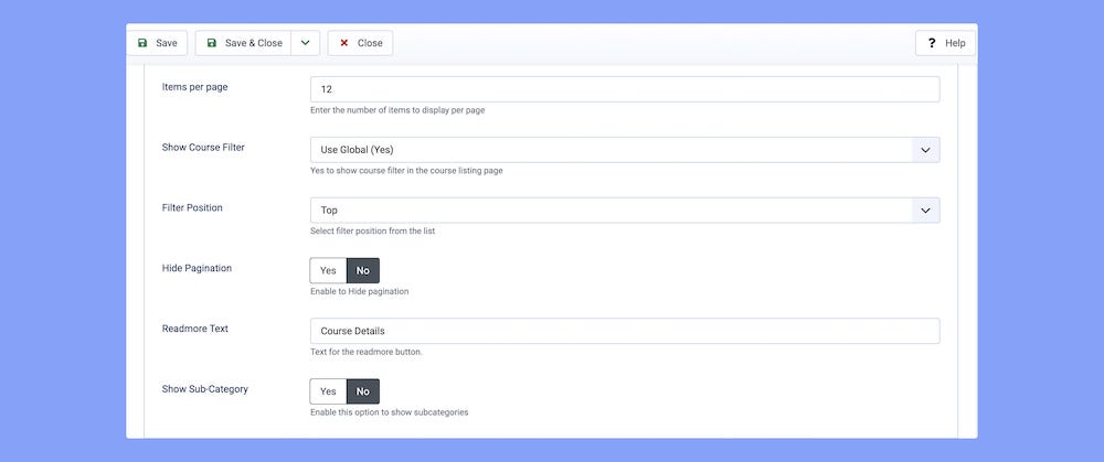 In this update, we have added a “Show Sub-Category” option in the course settings (In Menu). If you enable the Sub-Category option, it will show the courses of both the parent category and its subcategory on the Front-End Courses page.