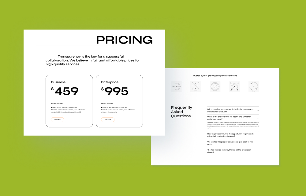 Showcase your pricing options in a clear and concise manner, highlighting the features and benefits of each plan. It also includes a section where you can showcase the renowned companies that trust your brand to establish your credibility in the eyes of your audience.