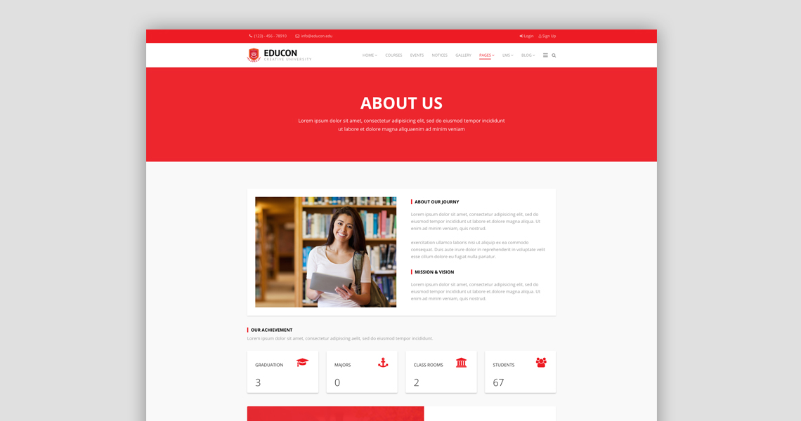 The latest variation of the About Us page in Educon details your institutional missions, visions and core statistics in a conspicuous manner. More new sections now have hover effects that make the entire environment more lively.