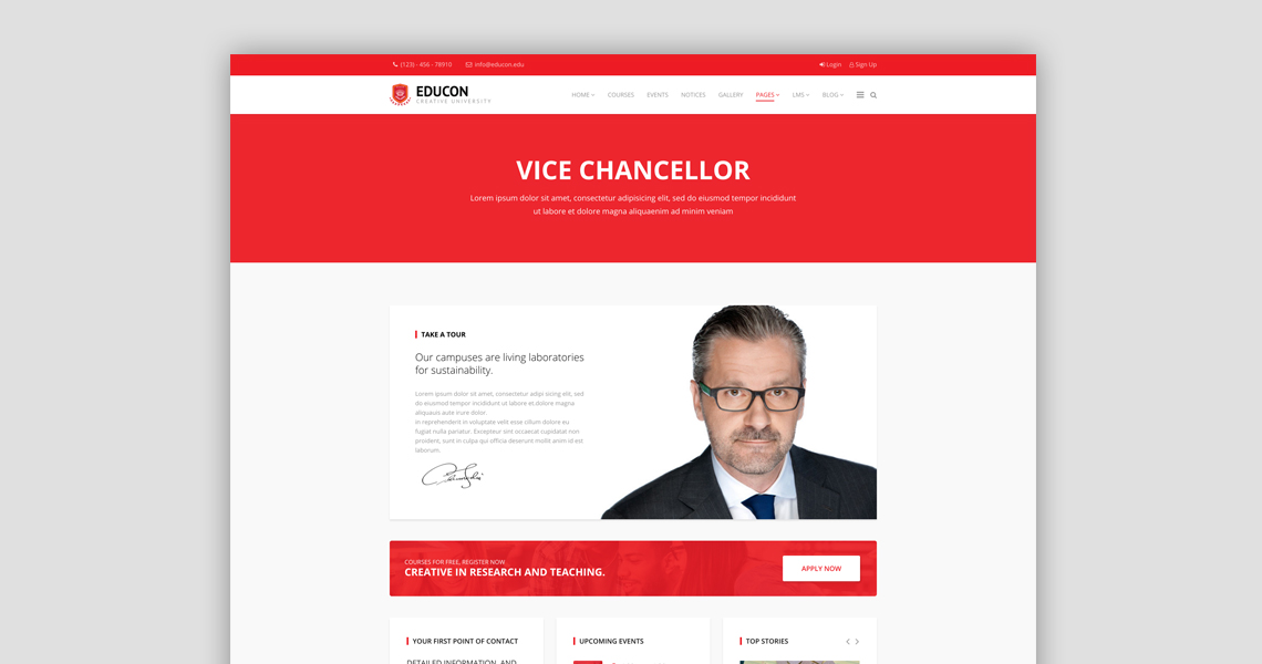 Your university or academic website needs some special pages for the special persons involved with the institution. For this reason, we’ve designed a special page called Vice Chancellor, which you can use and customise to show information about the high profile persons of your organization.