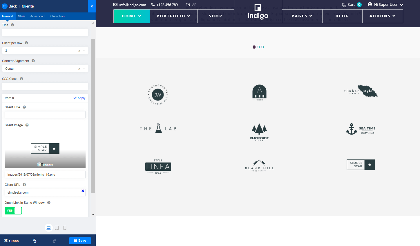 Moving on to the Clients addon, at first we will add all the logos. To add more clients, click on “Add Item” and add as many as you want. Make sure to change the “Client per row” and you can change content alignment to center. For our tutorial today, we’ll use 3 clients per row and a total of 9 clients.