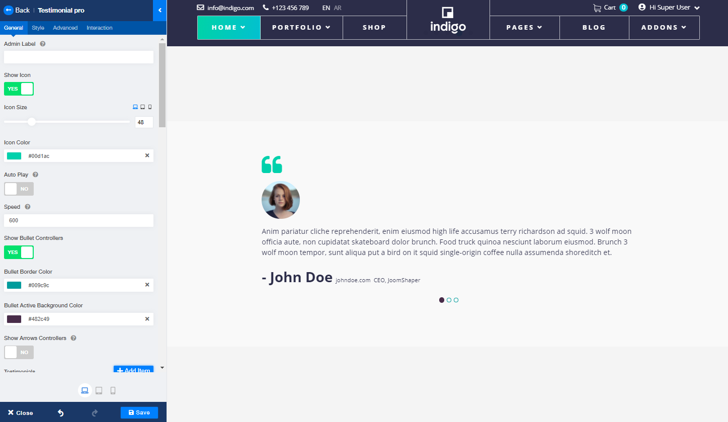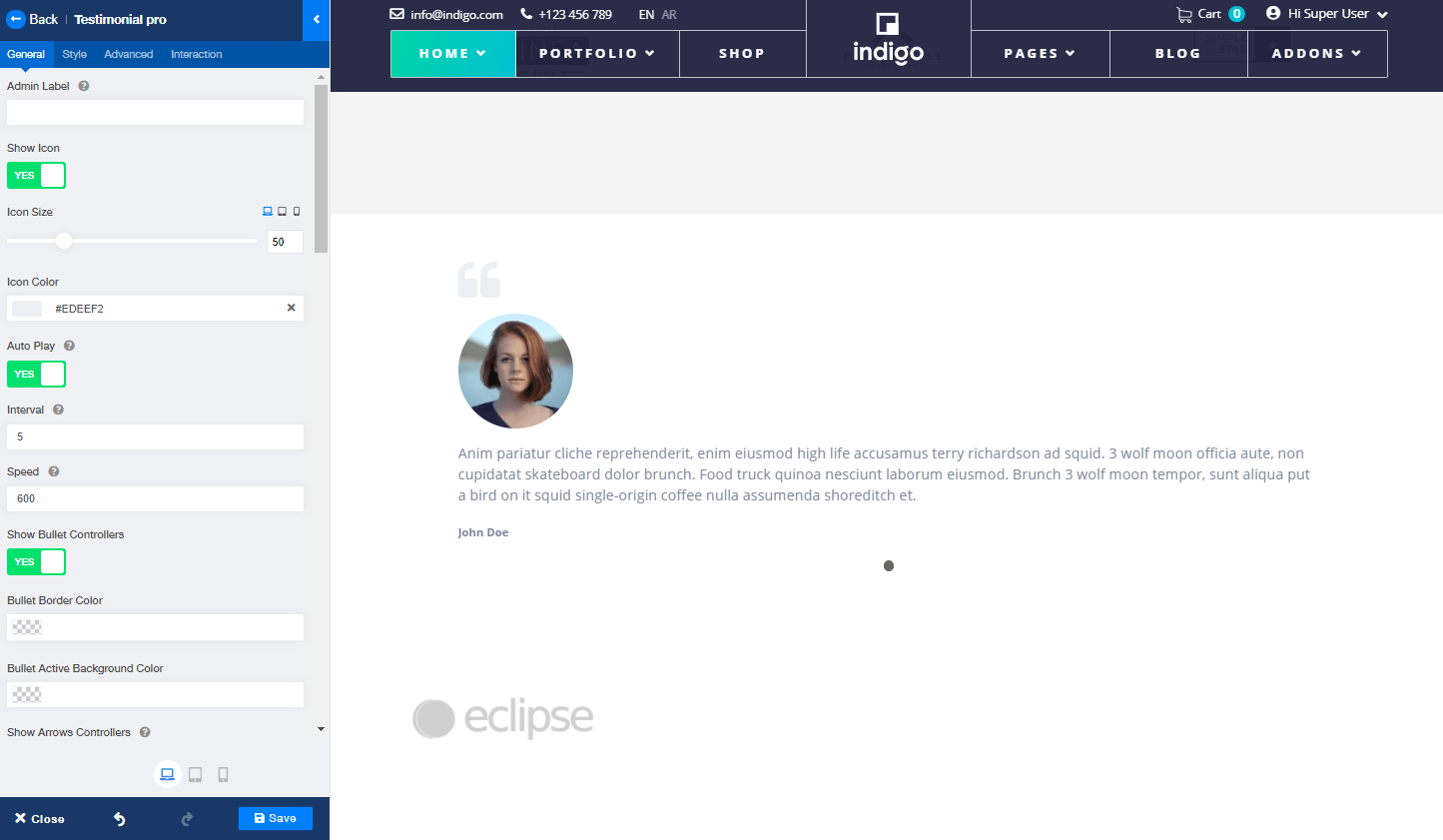Moving on, we will add an image for the clients’ avatars, and then increase the size of the avatar image by adjusting the “Avatar Width” slider in the General tab of this addon. I will also increase the size of the icon by adjusting the "Icon Size" slider.