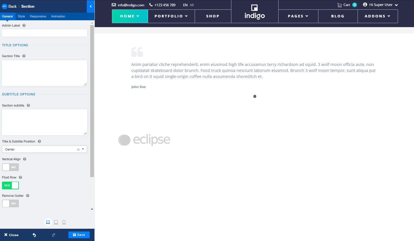 First things first, we will enable “Fluid Row” from the section settings of both our rows so that we can select a custom width for both. Then, we will add a generous padding around the Testimonial Pro addon. For this use case, I used 270px.