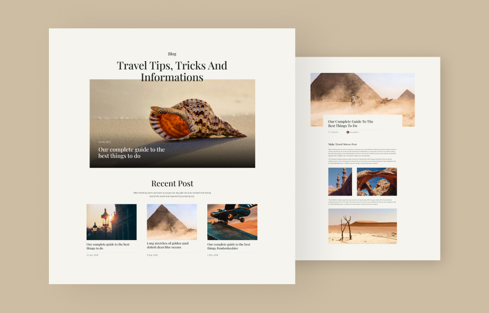 Take your travel storytelling to the next level through the ready-to-use blog pages. The clean and minimal travel blog page layout will surely attract travelers' and explorers' attention to capture the world around them. Enjoy the convenience of the beautifully crafted design with easy navigability, an attractive hero section to highlight the latest post, and glimpses of stories through card-style layouts.
