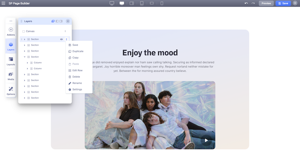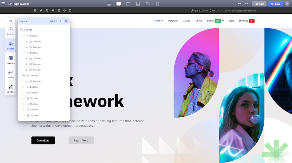 SP Page Builder 4 has been designed keeping user convenience at the core. And in this whole process of simplifying the user experience, Layers have added a new dimension. This new addition to the Page Builder family not just allows you to create a hassle-free workflow but also saves your valuable time by letting you see the changes instantly.
