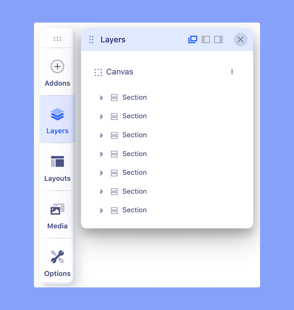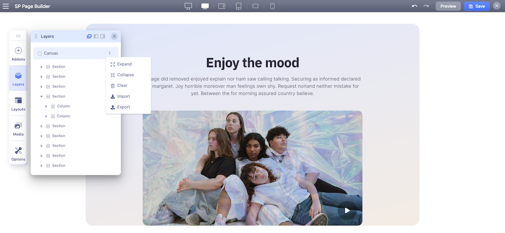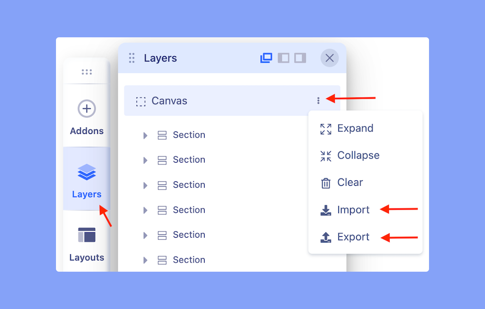 The Canvas contains all the sections of your page that you are currently working on. When you click on the three vertical dots beside the Canvas, it should expand the available options. These options will let you expand or collapse all the sections and the associated columns and addons, clear the page canvas, or export & import any of your previously saved page layouts.