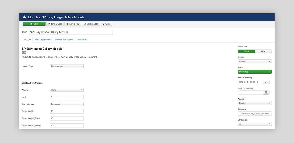 With the new update, now you can showcase gallery images, albums, album listings in any module position in the SP Easy Image Gallery component. You can showcase gallery images to any position, wherever you want with this introducement of new module with this new update. This brings more flexibility and mobility while rendering SP Easy Image Gallery to web pages.
