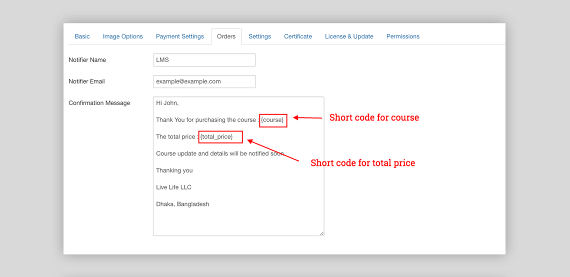 Once an item is purchased, an email notification is now provided from SP LMS 2.2. You have to add a confirmation message and customize it in the options order page. There are two shortcodes while customizing the confirmation message. {course} represents the course the user purchased and {total_price} accounts for the total price the user paid in purchase.