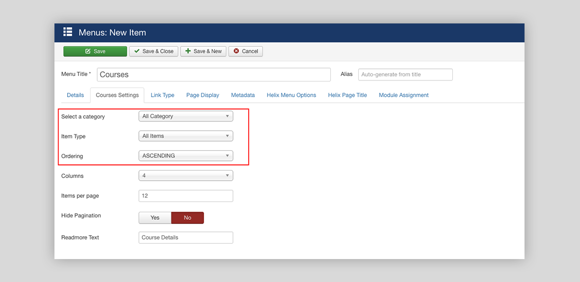 Events and courses options in menu now have more settings options. Now you can select category, item type and ordering in this new update.