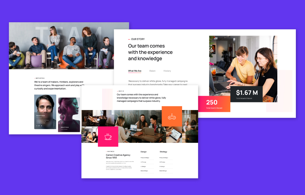 Present your business and team to the world with Wimble’s dedicated About and Team page. The pages are brilliantly segmented to present your services, experience, achievements, team members, and more. Let your business & the team take the spotlight and build trust and create a positive impact on your overall brand image. Team and About both pages come in a couple of stylish variations.