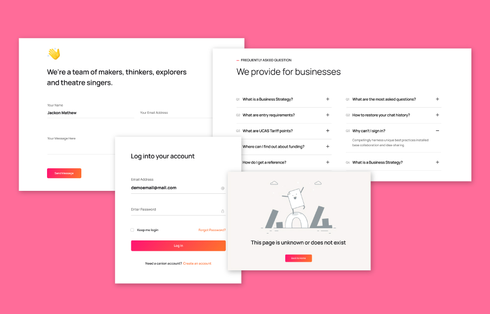 - 404: A predesigned 404 page to help the lost visitors navigate back to the Home page.