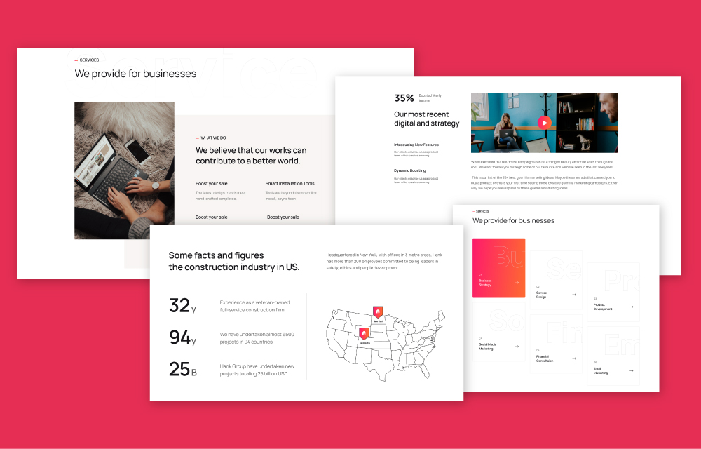 - Interactive: Make an interactive web presence for your business. You can have videos in the hero section, showcase your activities, company info, testimonials in an interactive home layout that your visitors enjoy most. Direct visitors to services with attractive CTA buttons. Showcase awards, company activities, and testimonials