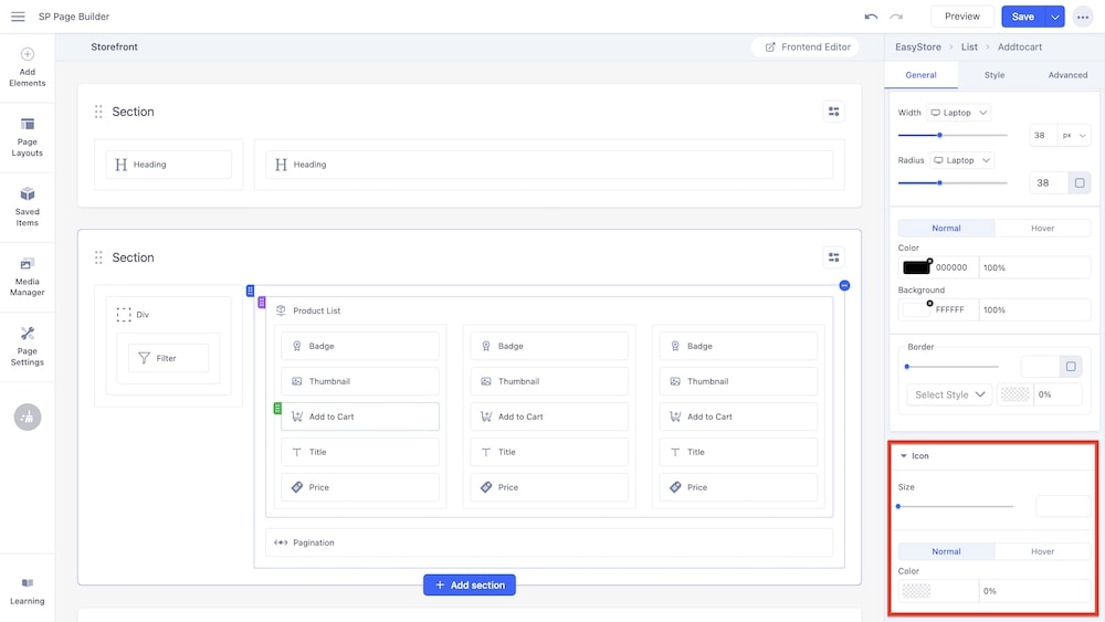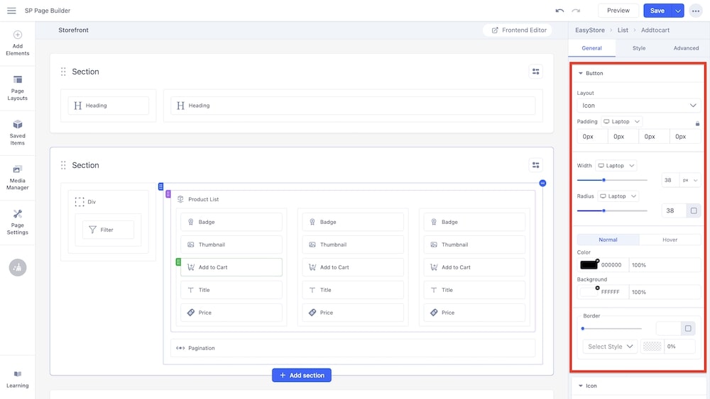 The Add to Cart addon enables customers to quickly add products to their shopping cart with a single click within your EasyStore Storefront page. You can personalize the button's icon, layout, style, border radius, border style, background, and more to match your store's design. This addon simplifies the purchasing process, enhances user experience, and encourages faster conversions.