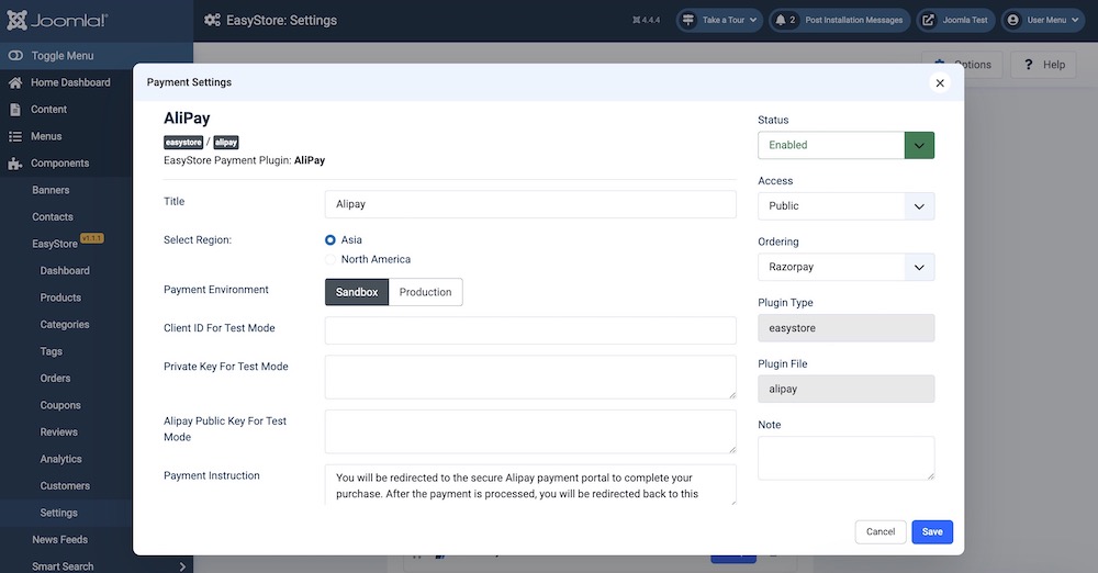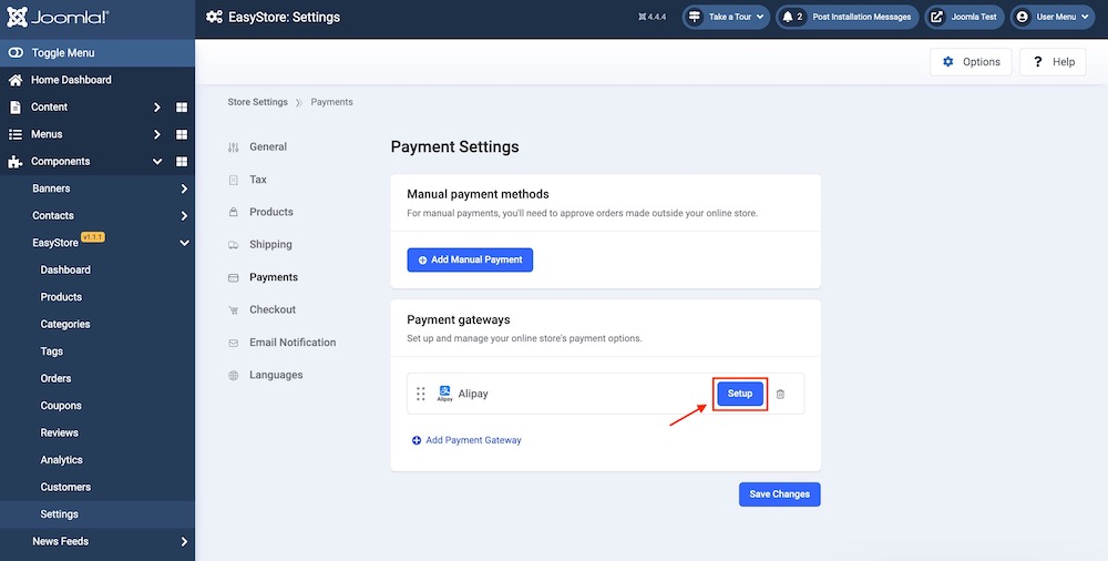 Log in to your Joomla Dashboard and navigate to Components > EasyStore > Settings > Payments.