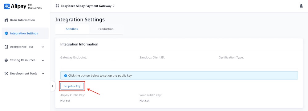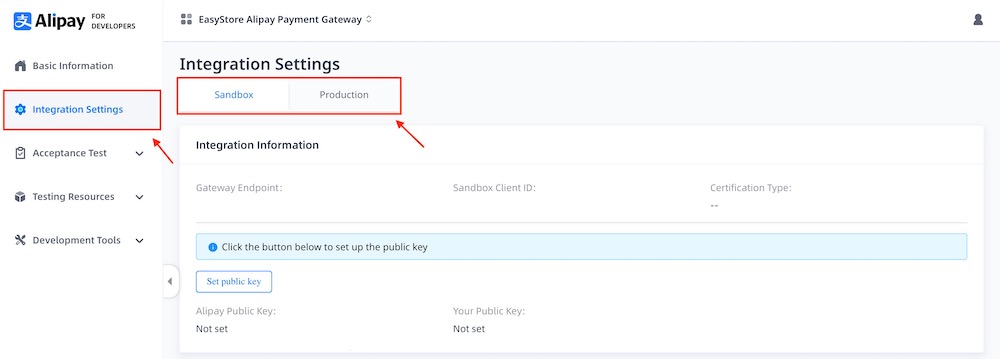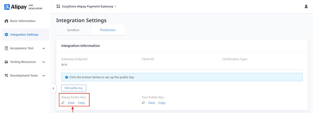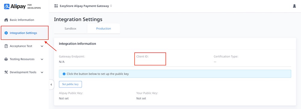 From your Alipay Application dashboard, navigate to Integration Settings. You'll see two modes: Sandbox and Production. In the Integration Information section, you'll find your Client ID.