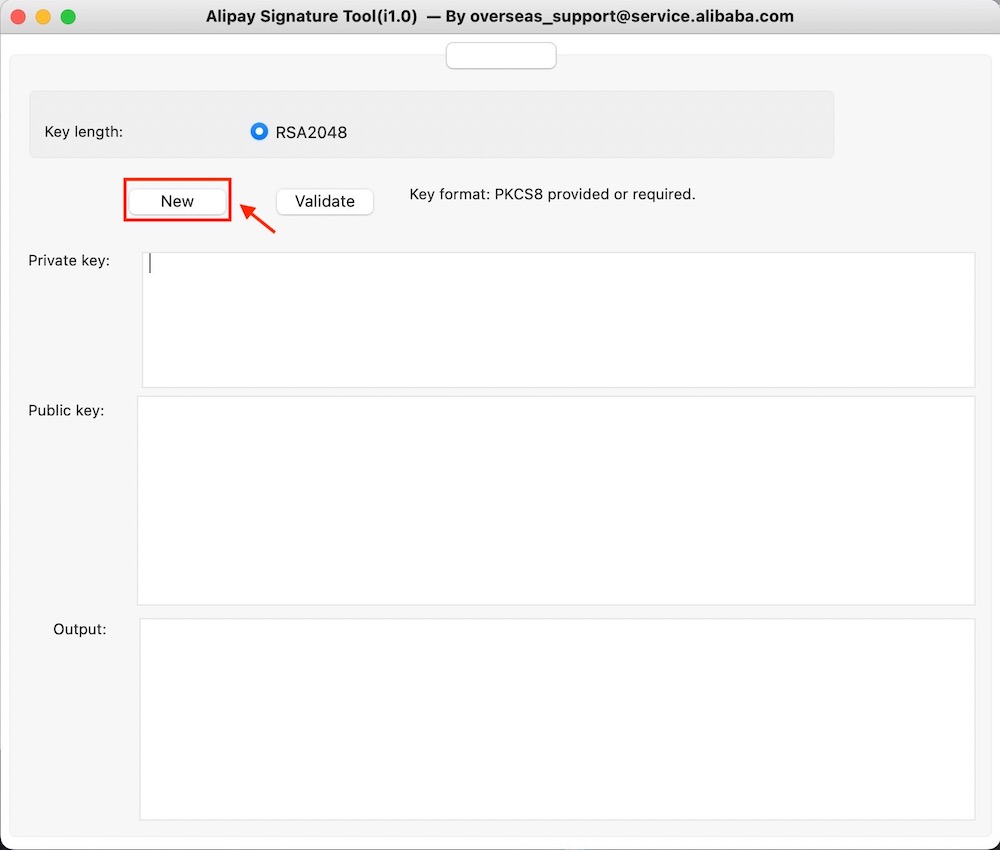After running the Run executable file, the Alipay Signature tool will appear. Click on the “New” button to obtain the Private and Public Key. Use this Private key while integrating the Alipay payment gateway in EasyStore. (Please note that the Public key generated in the signature tool is NOT the Alipay Public Key needed for the integration in EasyStore)