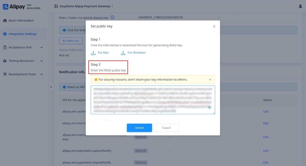 Now copy the Public Key generated in your Signature tool and return to the Alipay Application dashboard. Click on the "Set Public Key" button again. Paste the copied key in the given “Step 2” field and hit the "Submit" button.