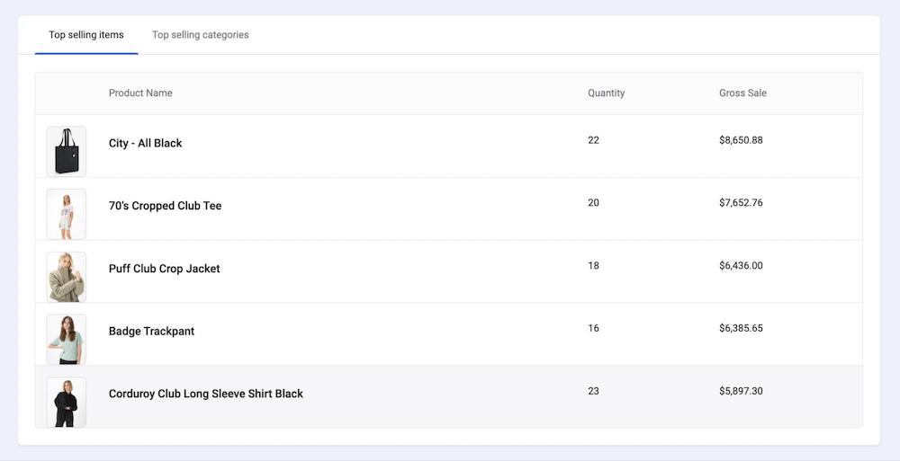 Top Selling Items: A list of the top-selling items, including their names, quantities sold, and gross sales.