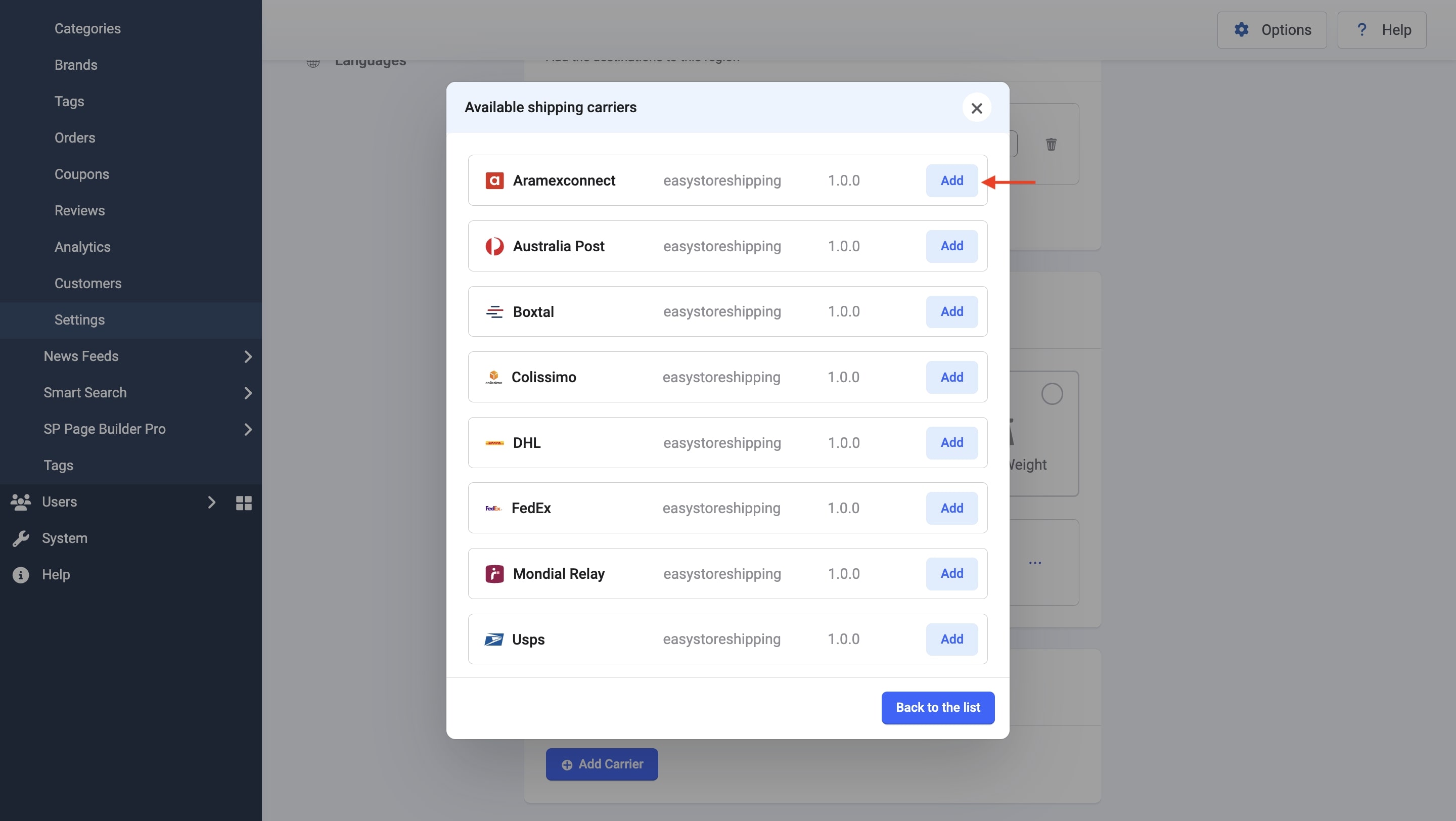 After completing the setup, click the "Back to the list" button. Aramex Connect will now be added to your store’s available shipping options.