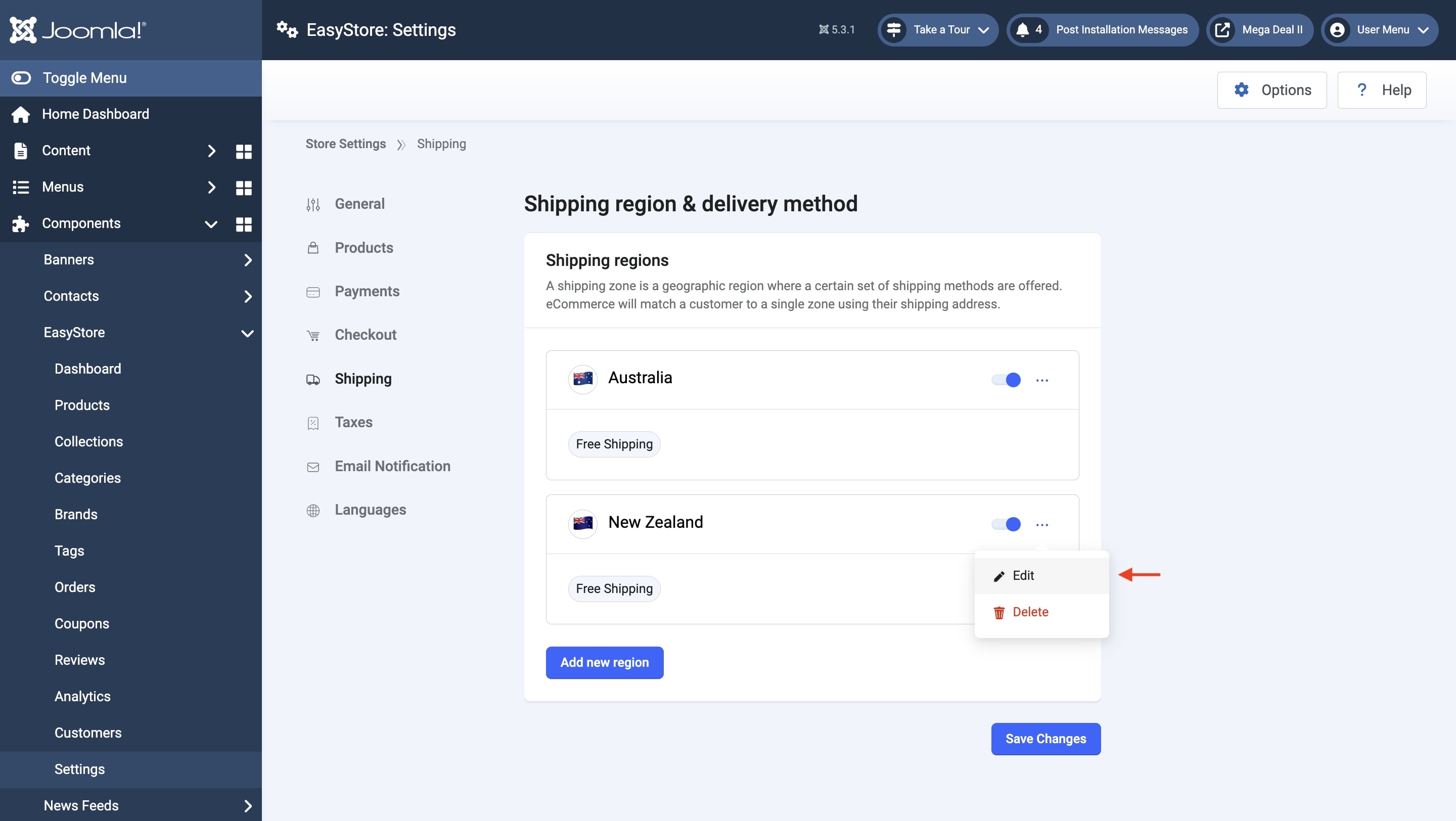 If your region is already set up, click the three-dot icon next to it and select Edit. If you haven't set up your regions yet, you'll need to configure them first before you can add any shipping carriers.