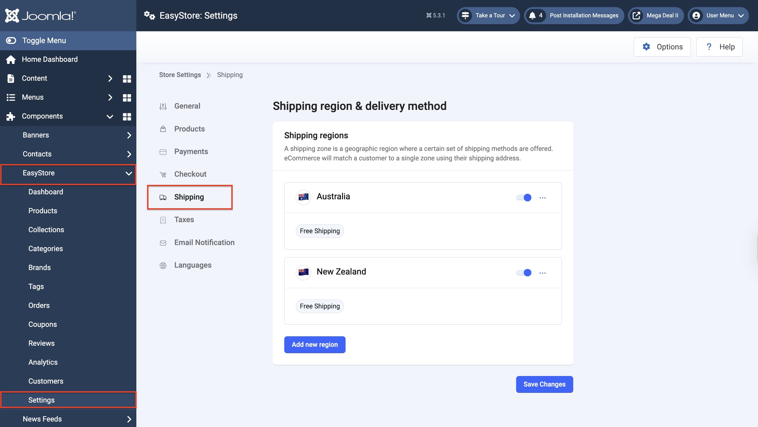 Log in to your Joomla Dashboard and navigate to Components > EasyStore > Settings > Shipping.
