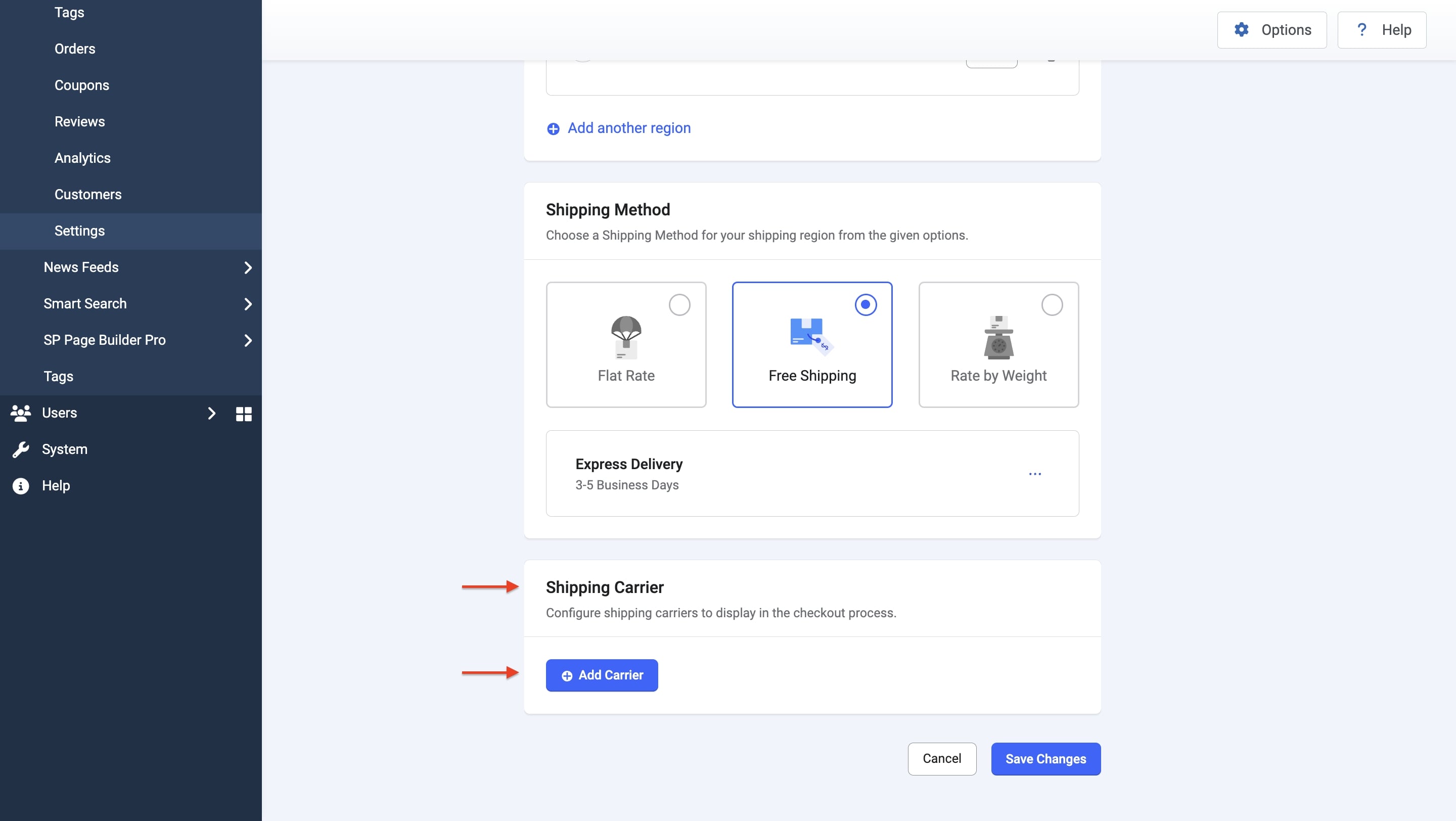 Scroll down to the Add Shipping Carrier section and click on the Add Carrier button to open the list of available shipping providers.