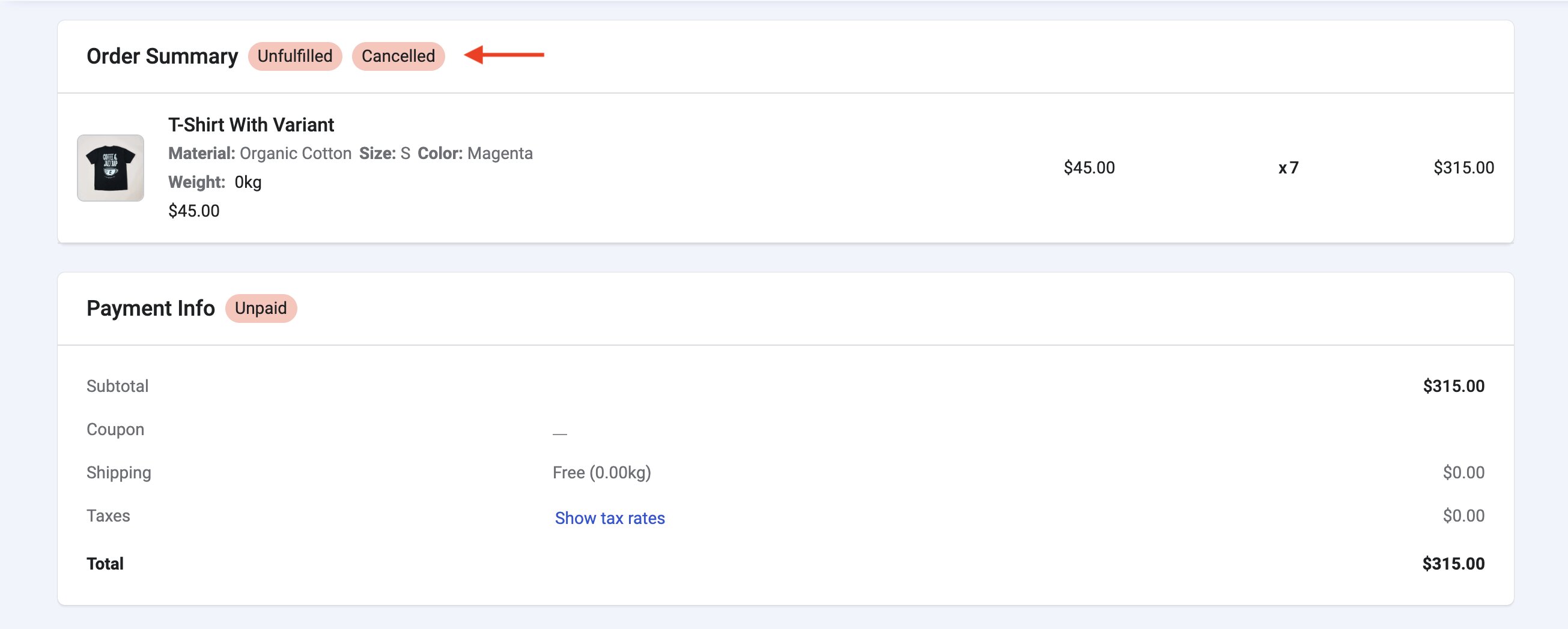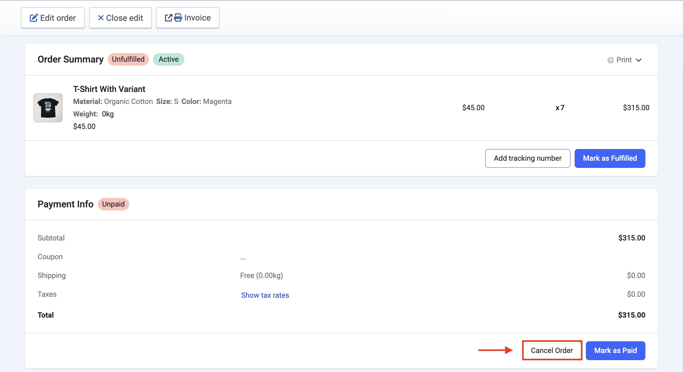 Under the Payment Info section, click on Cancel Order.