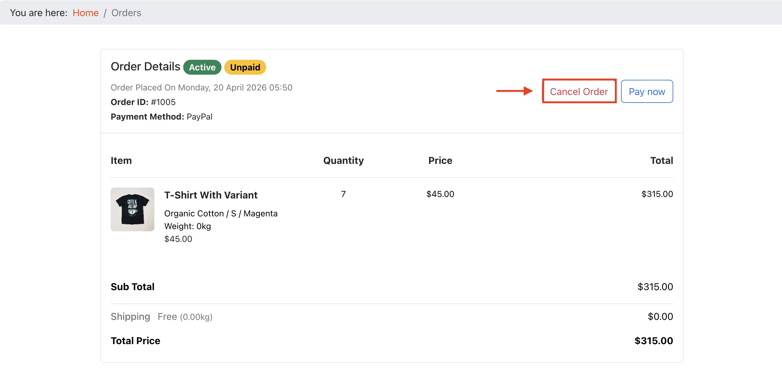 Within the Order Details page, they need to click on the Cancel Order button.