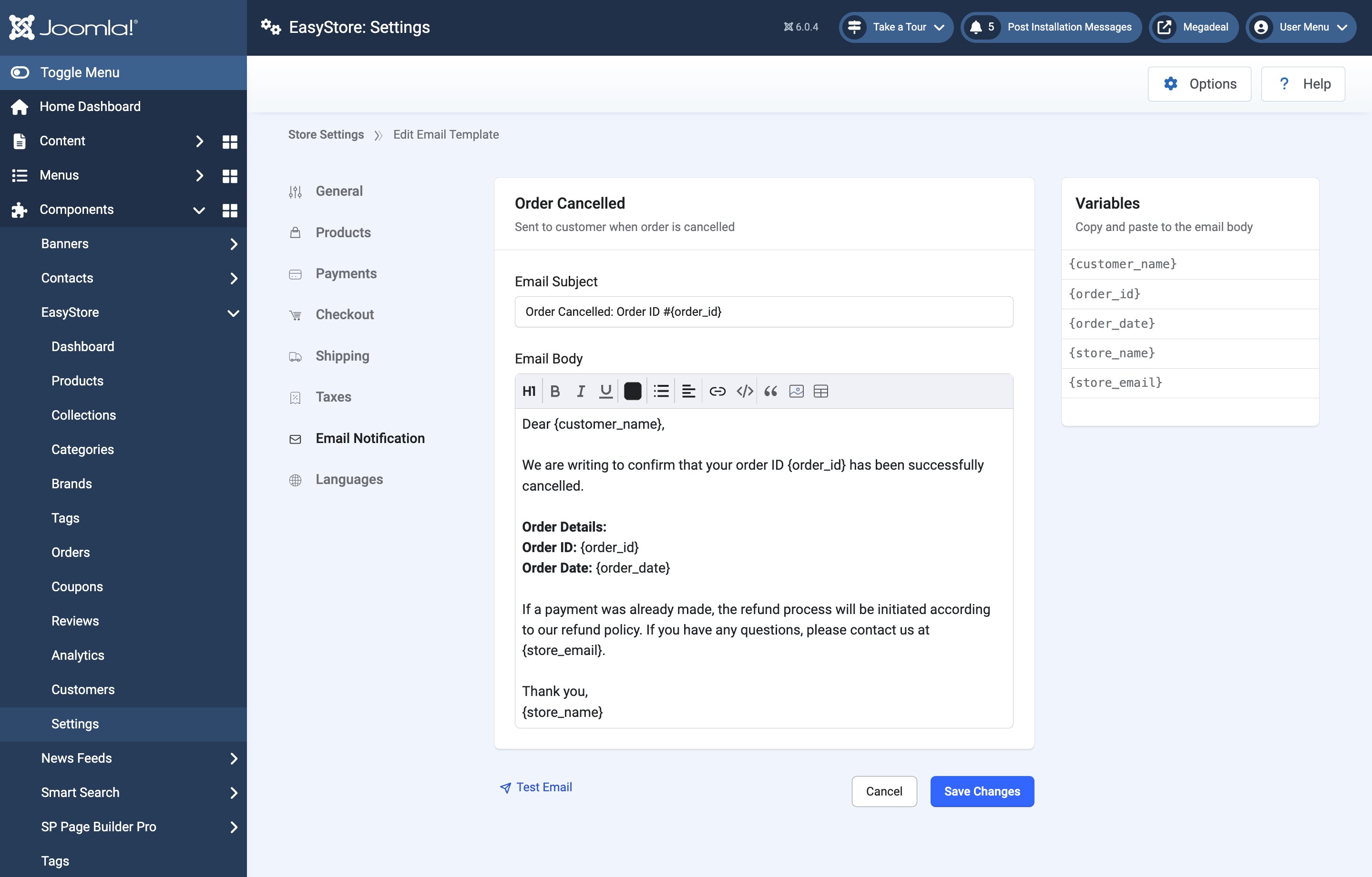 1. Go to Components > EasyStore > Settings > Email Notification > Order and enable the “Order Refund” setting.