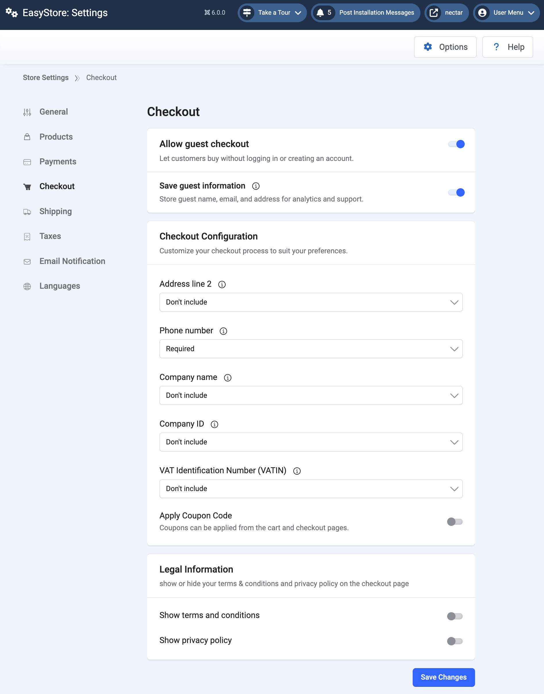 The Checkout tab within EasyStore's settings provides you with a range of options to configure your checkout process to best meet your specific needs.