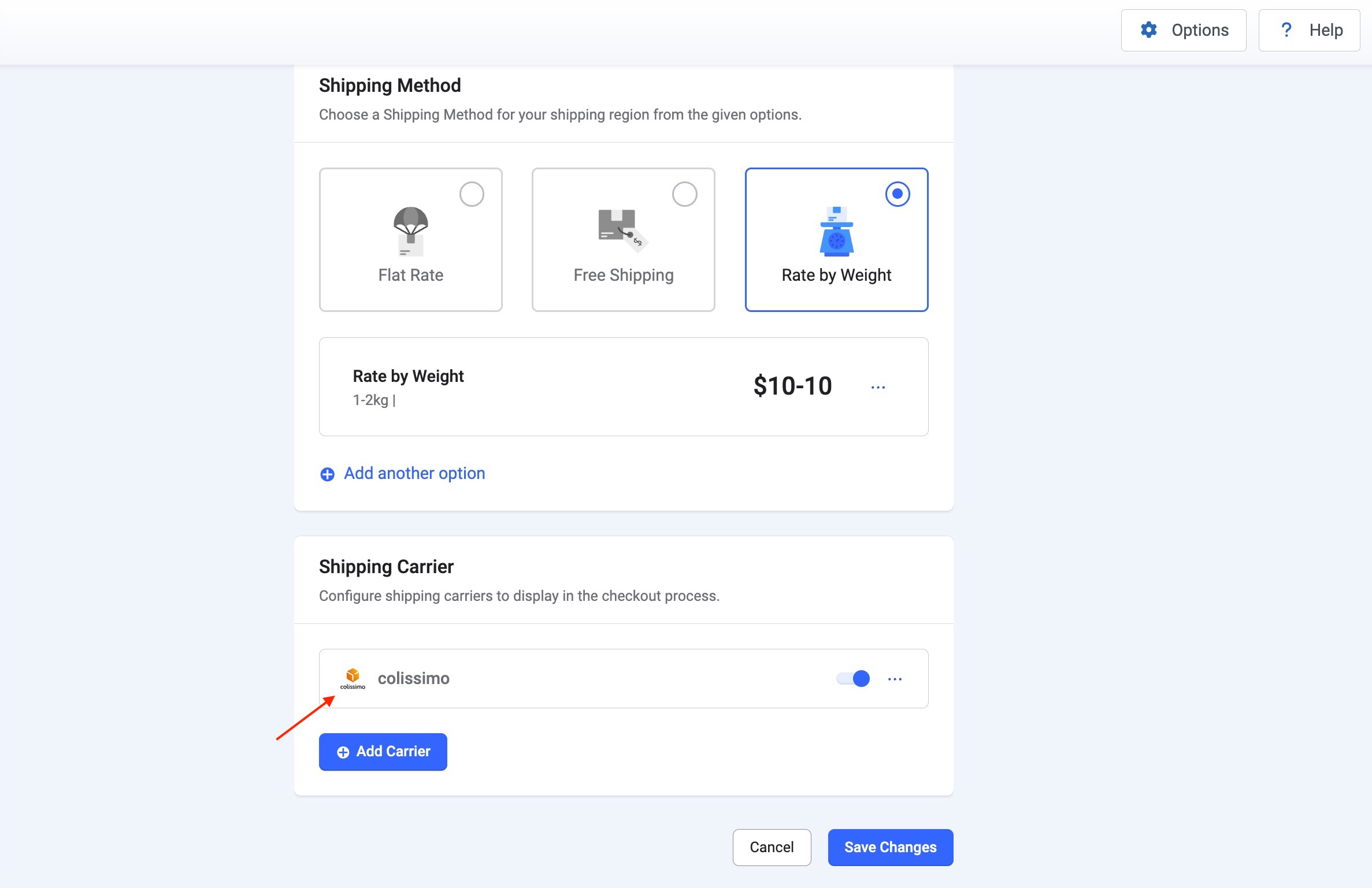 Scroll down to the Add Shipping Carrier section and click on the Add Carrier button to open the list of available shipping providers.