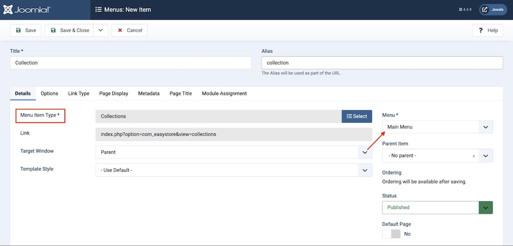Select Menu Item Type and choose EasyStore > Collections.
