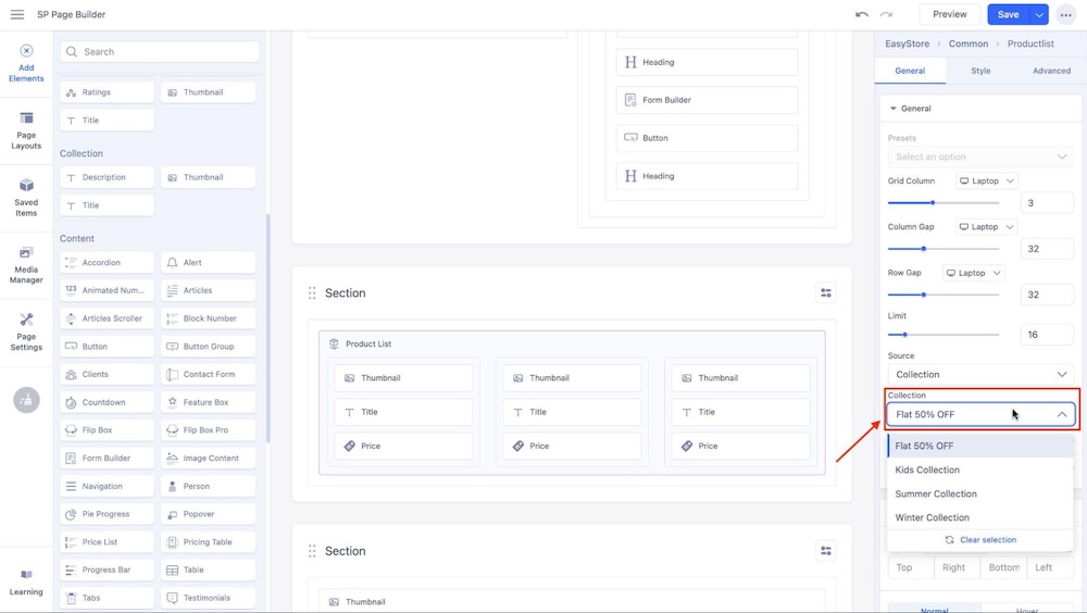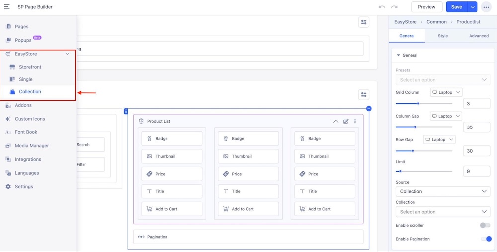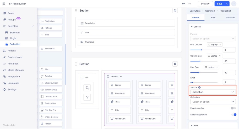 Set the Source of the Product List addon to Collection. This automatically connects all the collections you've created in EasyStore, allowing the Product List addon to dynamically fetch and display items from each collection.