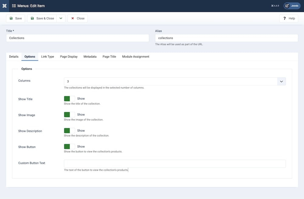 After you have assigned the Collections Menu Item, click on the Options tab to further customize the Collections Page, which will be accessed upon clicking the Collections Menu from your website. You will be presented with the following settings: