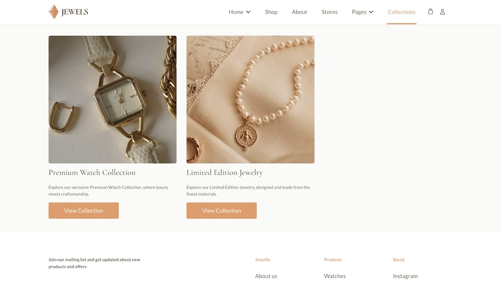 Note: If the Collection page is left blank or unpublished, the individual Collection page will revert to the storefront layout by default.