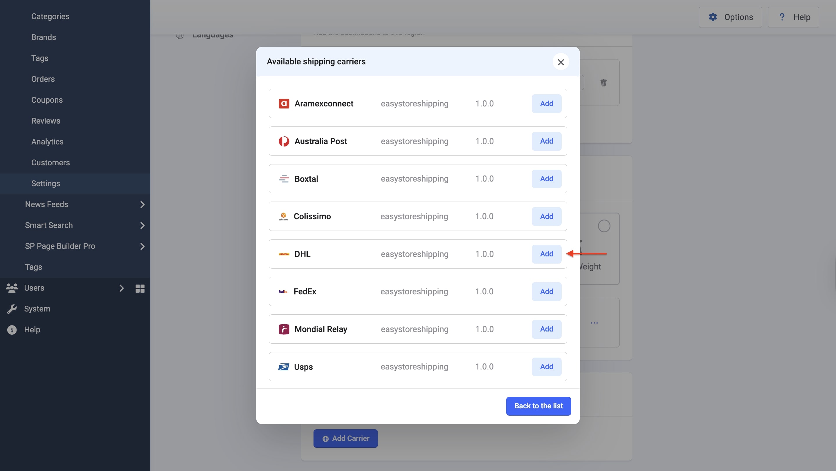 After completing the setup, click the "Back to the list" button. DHL will now be added to your store’s available shipping options.