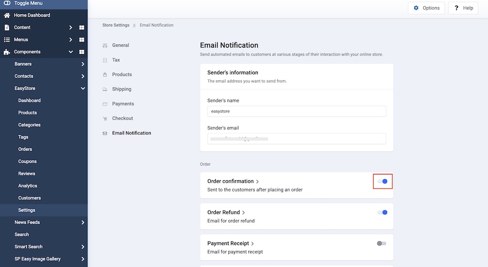 To configure Email Notification in EasyStore, go to your Joomla Dashboard > Components > EasyStore > Settings.