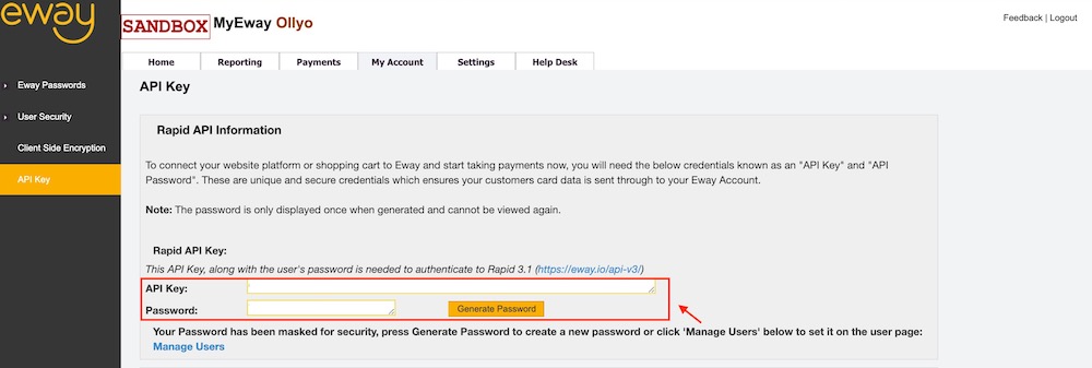 In the Rapid API Information Section, locate the Rapid API Key part. Here you can find both the API Key and the Password. Use this API Key and the Password while integrating the Eway payment gateway in EasyStore.