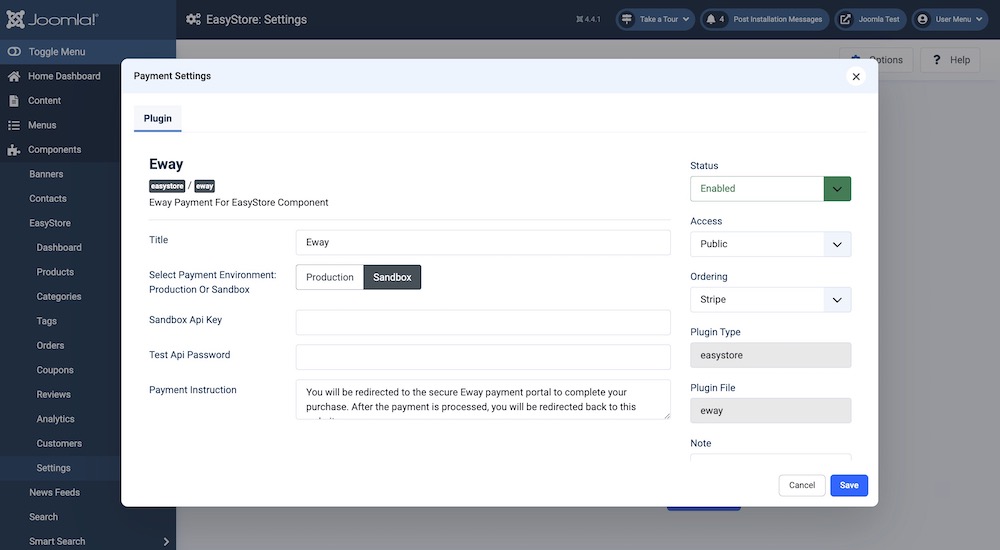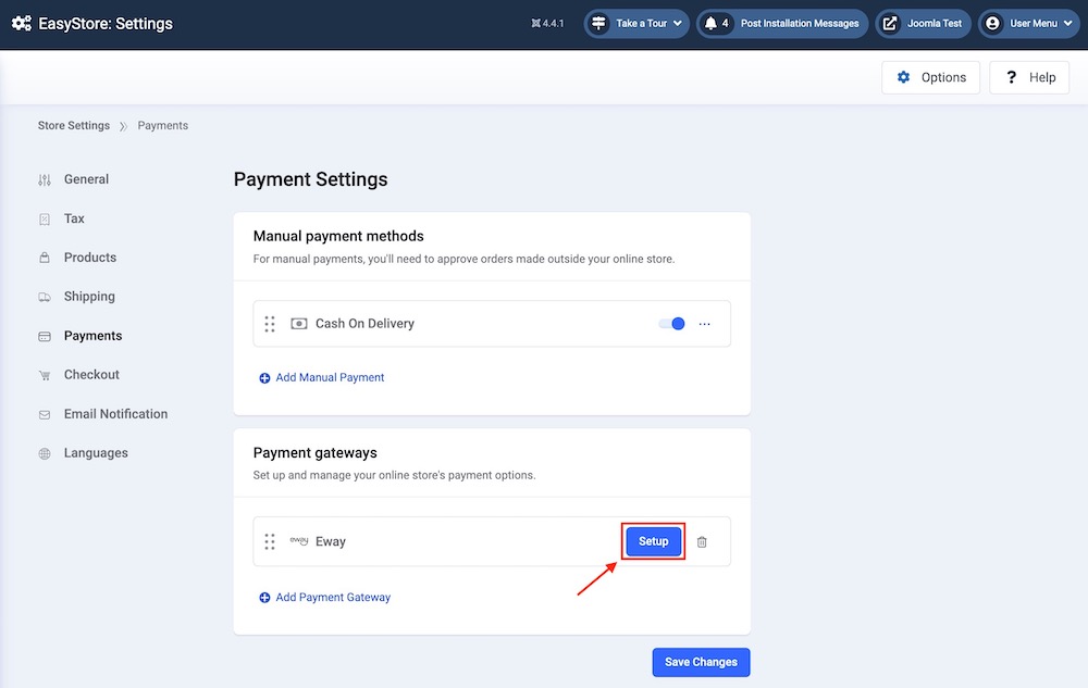 Log in to your Joomla Dashboard and navigate to Components > EasyStore > Settings > Payments.