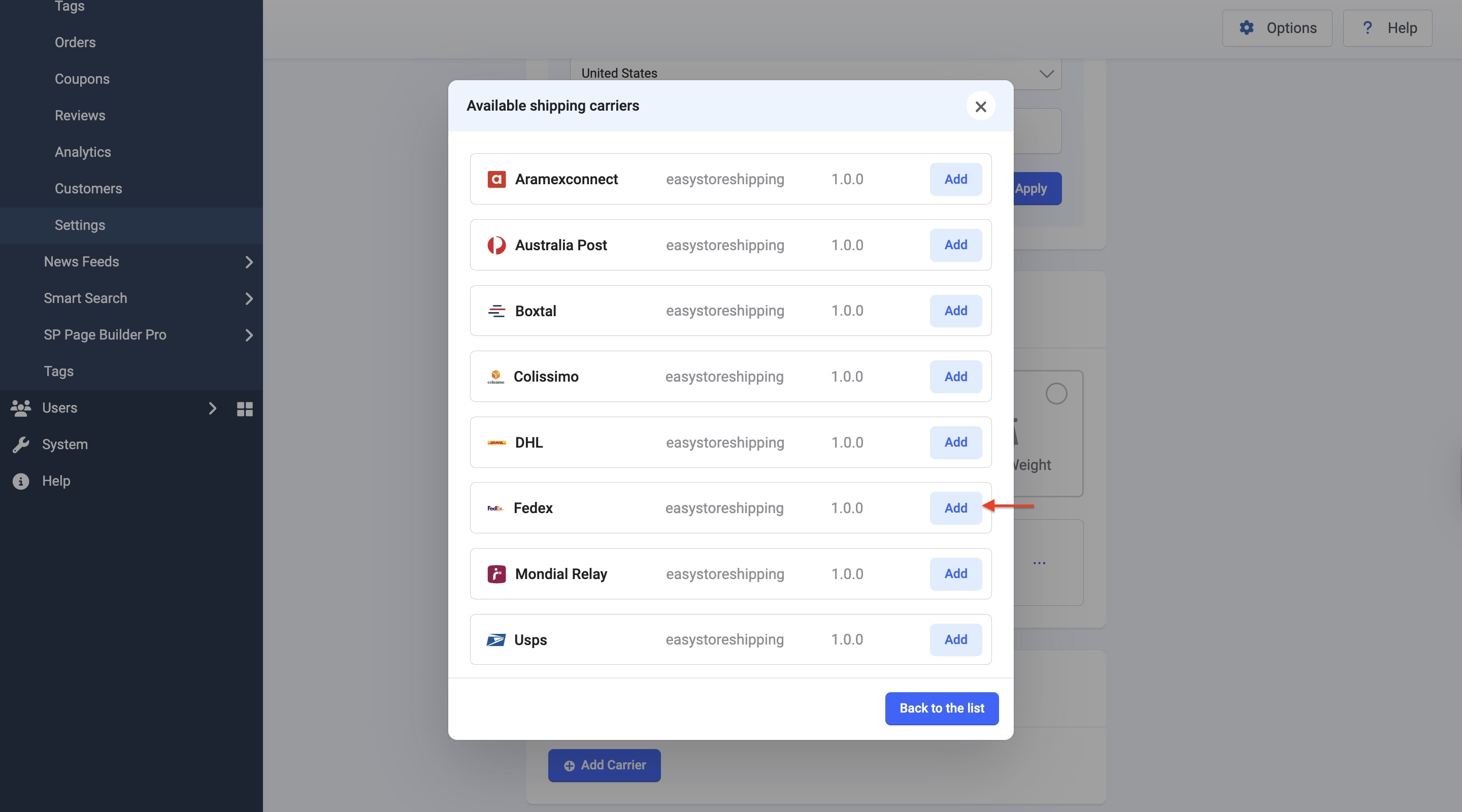 After completing the setup, click the "Back to the list" button. FedEx will now be added to your store’s available shipping options.