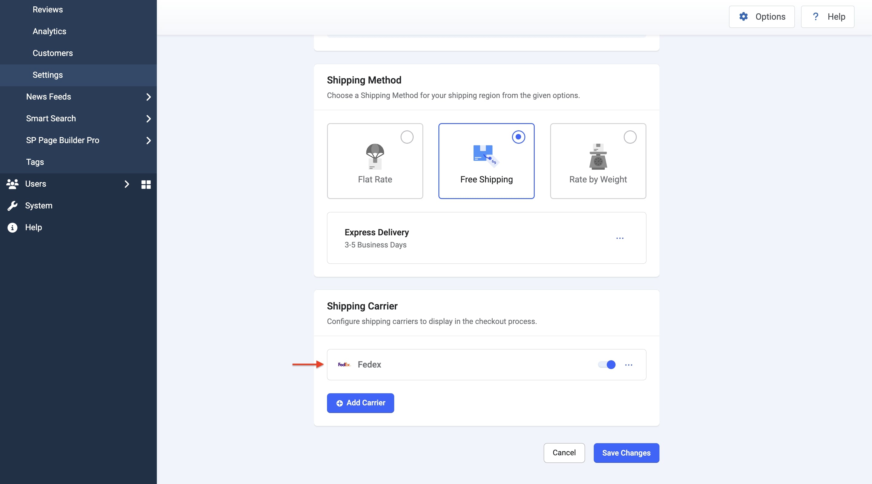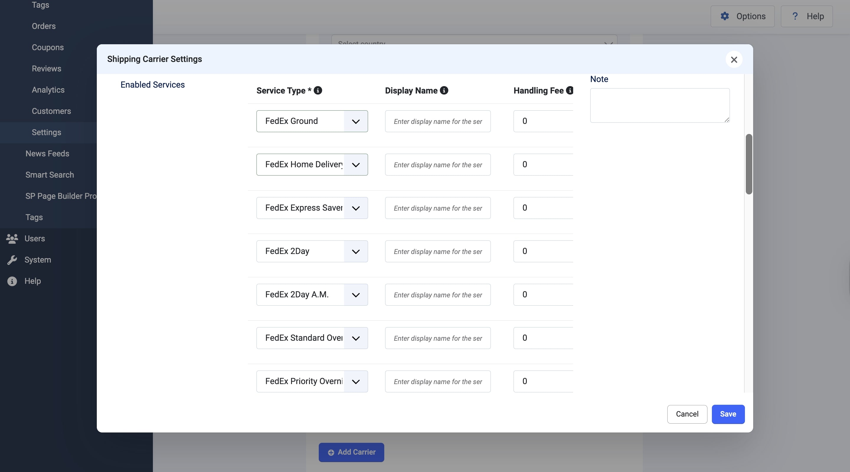 Scroll down to the Add Shipping Carrier section and click on the Add Carrier button to open the list of available shipping providers.