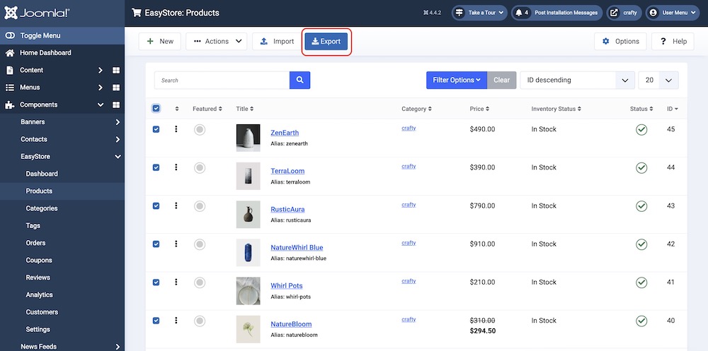 Select the products you want to export (optional: you can export all products by selecting the checkbox at the top).