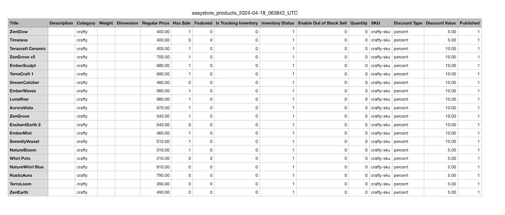 Note: The headers might vary depending on your EasyStore configuration and additional fields you might have enabled.