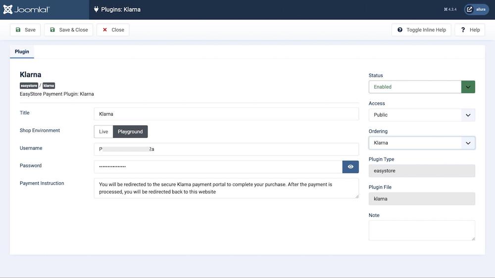 After entering the requisite information, click the Save & Close button to establish the connection between EasyStore and Klarna.